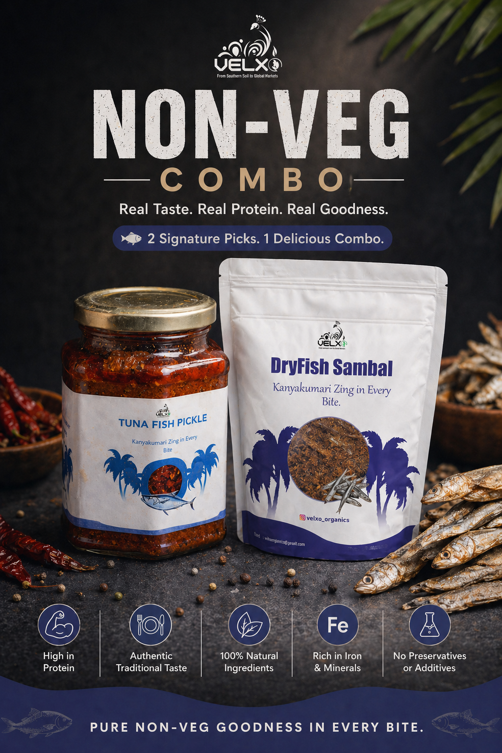 The Velxo Coastal Protein Delight Combo brings together two traditional favorites—Dry Fish Sambal and Tuna Fish Pickle—crafted with natural ingredients and bold South Indian flavors.