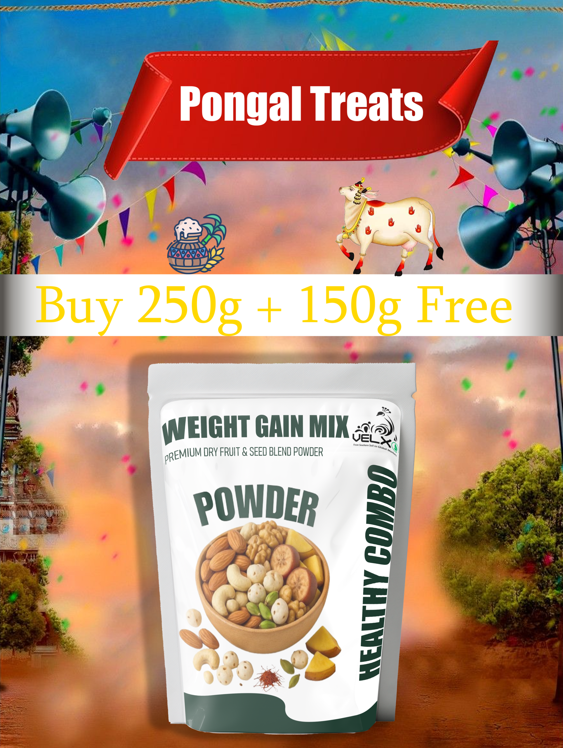 Velxo Organics Natural Weight Gain Mix is a nutritious blend of carefully selected nuts, dry fruits, seeds, and wholesome grains, gently roasted and finely powdered to preserve their natural goodness. This mix is designed for individuals who want to gain weight naturally without relying on artificial mass gainers or chemicals.