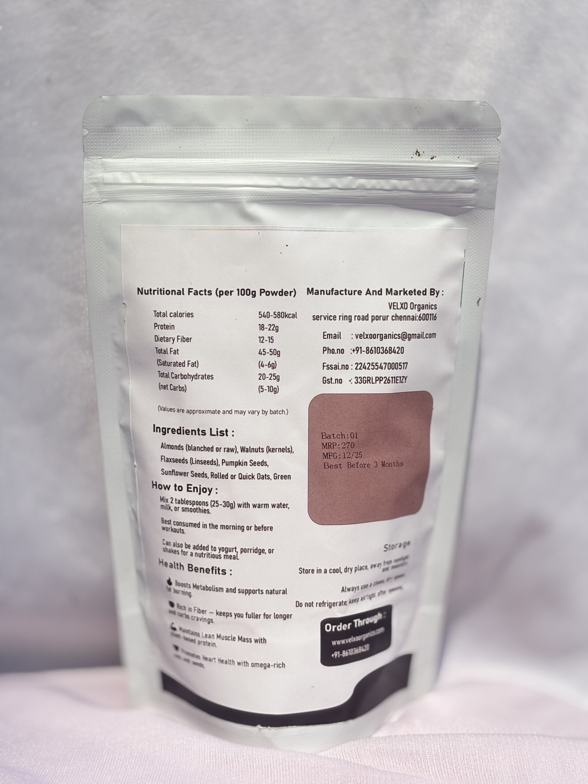 • Support: Email: velxoorganics@gmail.com | Phone: +91 86103 68420