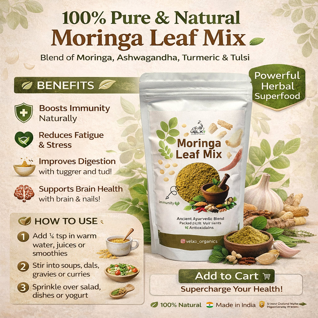 https://velxoorganics.com/product/premium-moringa-leaf-mix-100-natural-energy-immunity-booster/Moringa Leaf Mix is a natural powerhouse packed with essential nutrients, antioxidants, and plant-based proteins. This blend helps improve energy, immunity, and overall wellness. Handcrafted with care, our Moringa Leaf Mix is made from pure, organically grown moringa leaves to retain maximum nutrition.
