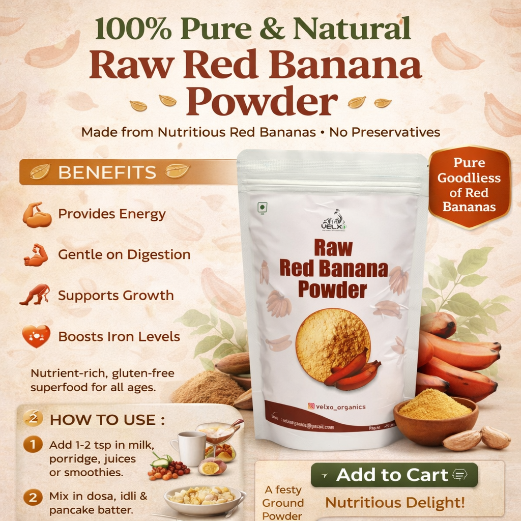 Premium Raw Red Banana Powder is a traditional, nutrient-rich food made from carefully selected unripe red bananas that are naturally processed to preserve their goodness. This powder has been used for generations in South India as a wholesome dietary ingredient for all age groups, from growing children to adults and elders. Prepared using hygienic drying and grinding methods, it retains its natural color, aroma, and nutritional value.